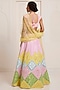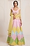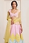 Featuring a pink lehenga in silk base with mirror and bead embroidery. It is paired with a blouse and a yellow organza dupatta. Style this set with chunky statement earrings, heels and a sleek clutch, perfect for a sangeet ceremony or weddings.