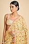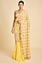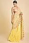 Featuring a yellow pre-stitched saree in georgette base with embroidery. It is paired with a blouse. Style this set with chunky statement earrings, heels and a sleek clutch, perfect for a haldi ceremony or weddings.