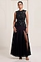 Featuring a black top in crepe and net base with embellishments. It is paired with a godet skirt and a belt. Accentuate it with dangler earrings and heels for a cocktail parties or glam evenings.