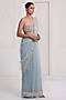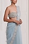 Featuring a blue saree in net base. It is paired with a bralette having cut beads embroidery and an underskirt. Style it with statement earrings and heels for a wedding, sangeet or engagement ceremony.