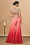 Featuring a nude top in net and georgette base with coral embroidery. It is paired with a coral ombre godet sharara pants. Style it with statement earrings and heels for festive occasions, sangeet or engagement ceremony.