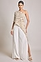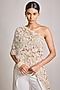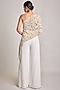 Featuring an ivory one-shoulder asymmetrical top in net and georgette base with pearl embroidery. It is paired with wrap pants. Accentuate it with dangler earrings and heels for a festive occasion, cultural event, engagement or sangeet ceremony.