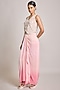 Featuring an ivory-pink ombre draped skirt in silk and georgette base. It is paired with a pearl embroidered waistcoat. Accentuate it with dangler earrings and heels for a festive occasion, engagement, wedding or sangeet ceremony.