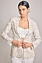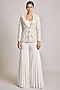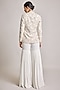 Featuring an ivory jacket in silk and georgette base with pearl embroidery. It is paired with a bralette and sharara. Accentuate it with dangler earrings and heels for a festive occasion, wedding, engagement or sangeet ceremony.