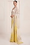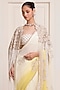 Featuring an ivory-yellow ombre saree in net and georgette base. It is paired with a pearl embroidered bustier, including cape having pearl tassel detail and an underskirt. Accentuate it with dangler earrings and heels for a festive occasion, haldi, engagement or sangeet ceremony.