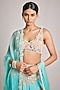 Featuring a turquoise lehenga in crepe and net base with pearl embroidery. It is paired with a blouse and dupatta. Accentuate it with dangler earrings and heels for a festive occasion or wedding ceremony.