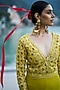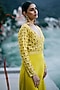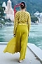 Featuring a yellow jumpsuit in net and pure crepe base with godet. Style it with statement jewellery, heels, a sleek bun, and a clutch bag for evening soirees.