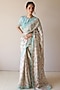 Featuring a beige saree in handwoven organza mulberry silk base with floral hand paint. Accentuate it with a blouse, dangler earrings and heels for a festive occsion or pooja ceremony.