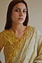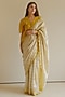 Featuring a beige saree in handwoven organza mulberry silk base with hearts and floral hand embroidery, including a yellow ochre floral embroidered scallop border detail. Accentuate it with a blouse, polki jewellery and block heels for a wedding or engagement ceremony.