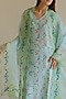 Featuring a blue kurta in handspun malda silk base with a V-neckline, hand painted print and bead work. It is paired with silk printed pants. Accentuate it with statement jewellery and block heels for a festive or pre-wedding ceremony.