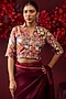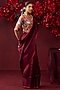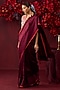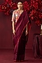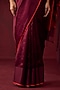 Featuring a burgundy saree in handwoven silk mesh base with satin border detail. Accentuate it with a blouse, polki jewellery and block heels for a wedding or sangeet ceremony.