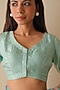 Featuring a coral blue and beige checkered blouse in handwoven organza mulberry silk base with a V-neckline. Accentuate it with a saree, statement jewellery and block heels for a festive or pre-wedding ceremony.
