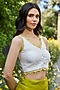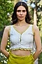 Featuring an ivory padded blouse in handwoven organza mulberry silk base with a V-neckline and floral lace embroidery. Style it with a saree and dangler earrings for a festive occasion, cultural event or pooja ceremony.