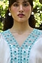 Featuring an ivory blouse in handwoven organza mulberry silk base with a V-neckline, soft gathered sleeves and floral lace embroidery. It is paired with a slip. Style it with a skirt, dangler earrings and heels for a festive occasion, cultural event or pooja ceremony.