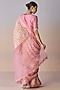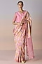 Featuring a pink saree in handwoven organza mulberry silk base with bead and sequins work, including floral print and floral hand embroidery. Accentuate it with a blouse, polki jewellery and block heels for a wedding or engagement ceremony.