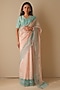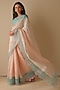 Featuring a soft pink and coral blue saree in handwoven organza mulberry silk base with embroidery and organza border detail. Accentuate it with a blouse, polki jewellery and block heels for a wedding or engagement ceremony.