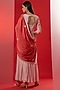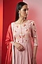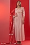 Featuring a blush pink padded anarkali in georgette and satin base with a thread embroidered yoke and pleated flare work. It is paired with a contrasting bright red dyed dupatta having pearl detailing.