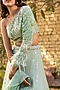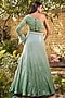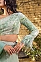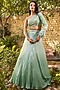 Featuring a green ombre lehenga in georgette crepe base with sequin embellishment. It is paired with a matching one shoulder crop top having feather detailings, and floral motif hand embroidery, including an organza ruffled dupatta.