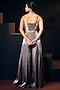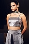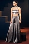 Featuring a grey crop top in tissue organza silk base with sequins hand embroidery. It is paired with flared pants. This stylish ensemble is the perfect choice for a hands-free sangeet or a lively DJ night, making it an ideal pick for a modern bridesmaid who loves comfort with a touch of glamour.