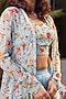 Featuring a light blue jacket in georgette base with hand embroidery. It is paired with a matching bustier and pants.