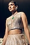 Featuring a nude lehenga in tissue organza silk base, adorned with floral motifs, sequins, and threadwork. It is paired with a blouse and a ruffled dupatta. Accentuate lehenga set with jewellery, a coordinated clutch and classic embellished heels for sangeet, wedding ceremony or festive occasions. This versatile set fits every occasion flawlessly.