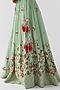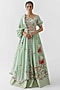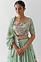 Featuring a sea green lehenga in georgette and tussar silk base with pearl embroidery. It is paired with a matching padded blouse having puffed sleeves, a ruffled dupatta, and an attached embroidered belt.