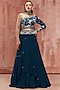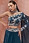 Featuring a teal blue layered lehenga in georgette crepe and satin silk base with an embroidered belt. It is paired with a matching one shoulder top having zardosi hand work and a pre draped choker dupatta.