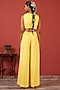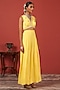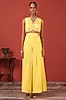 Featuring a yellow blouse in georgette crepe base with hand embroidery. It is paired with pleated pants. Accentuate with statement earrings and heels for a festive occasion, haldi or evening look.