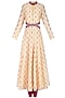 Featuring a beige chanderi anarkali with pink and gold moroccon print with collar and side cut out detailing. It comes along with pink chanderi churidaar and beige dupatta in chanderi with pink border.