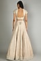 Featuring a beige and gold lehenga in raw silk base with thread embellishments. It is paired with a matching blouse and a dupatta.