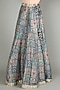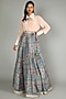 Featuring a blue and blush pink lehenga in satin silk base with galeecha patchwork print. It is paired with a matching blush pink shirt having gathered sleeves.