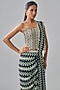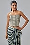 Featuring a blue draped saree in crepe base with chevron print. It is paired with an embellished corset. Accentuate it with jewellery and heels for a festive occasions or wedding ceremony.