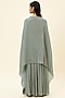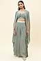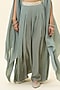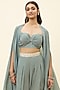 Featuring a blue cape in crepe base with boota print. It is paired with a matching bustier and box pleated pants.
