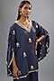 Featuring a blue tunic in silk base with v-neckline and embellishments. It is paired with pants. Perfect wear for a festive occasion or pooja ceremony.