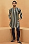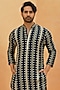 Featuring a midnight blue kurta in crepe base with geometric embroidery, kairo print, and a mandarin collar. It is paired with navy trousers. This ensemble strikes the perfect balance between sophistication and effortless style, making it an ideal choice for festive gatherings or evening celebrations.