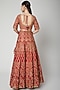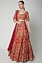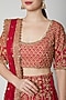 Featuring a red lehenga with heavy embellishment. It is paired with a matching blouse and dupatta.