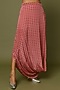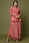 Featuring a red peplum top in crepe silk base with print. It is paired with a matching draped skirt.