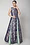 Featuring a midnight blue kurta in brocade base with high slit. It is paired with a matching skirt.