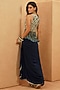 Featuring a midnight blue top in crepe base with geometric embroidery and bead fringe details. It is paired with a draped skirt. Accentuate it with minimal jewellery and heels for a festive occasions or wedding ceremony.