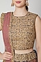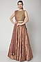 Featuring a old rose lehenga in brocade base with laser cut print. It is paired with a contrasting blue embroidered blouse and a net dupatta.