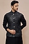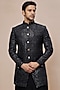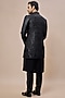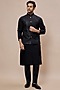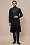 Featuring a black sherwani in silk and polyester base with geometric thread and zari embroidery. It is paired with a kurta and pants. Perfect attire for sangeet ceremonies, exuding charm and elegance.