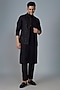 Featuring a black bundi jacket in silk base with sequins machine embroidery It is paired with a kurta and pants. Perfect for a festive occasion or pooja ceremony.