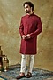 Featuring a bright wine red asymmetric indowestern jacket in faux silk base with hand embroidery. It is paired with pants. Perfect wear for a wedding, sangeet or reception ceremony.