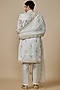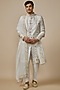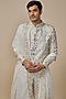 Featuring a cream sherwani in faux silk base with jaal machine embroidery. It is paired with pants and a stole. Perfect attire for a wedding or engagement ceremony, exuding charm and elegance.