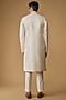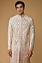 Featuring a cream and pink sherwani in faux silk base with laser cut hand embroidery. It is paired with a kurta and pants. Perfect wear for an engagement or a wedding ceremony.