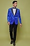 Featuring an electric blue tuxedo in velvet base with peak lapels. It is paired with a contrasting shirt, trousers and a bow-tie.