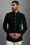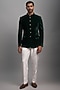 Featuring an emerald green bandhgala jacket in velvet base. It is paired with contrasting pants.