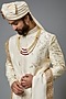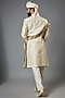 Featuring a gold sherwani in silk base with floral jaal hand embroidery. It is paired with contrasting pants, a kurta, a dupatta, a safa and a neckpiece.