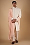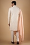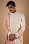 Featuring an ivory sherwani in japanese stretch base with floral jaal, pearl and cutdana embroidery. It is paired with a kurta, pants and a peach dupatta. Perfect wear for a wedding ceremony.