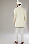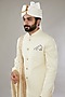 Featuring an ivory sherwani in raw silk base with thread and sequins embroidery. It is paired with a matching kurta, pants, a shawl, a pocket square, and a safa. Perfect wear for wedding and engagement ceremonies.